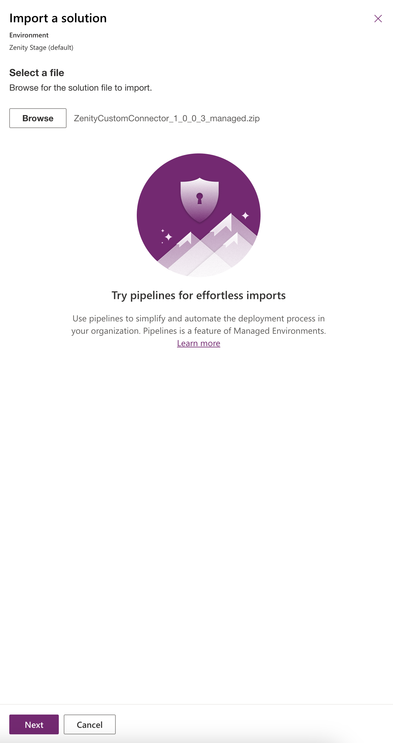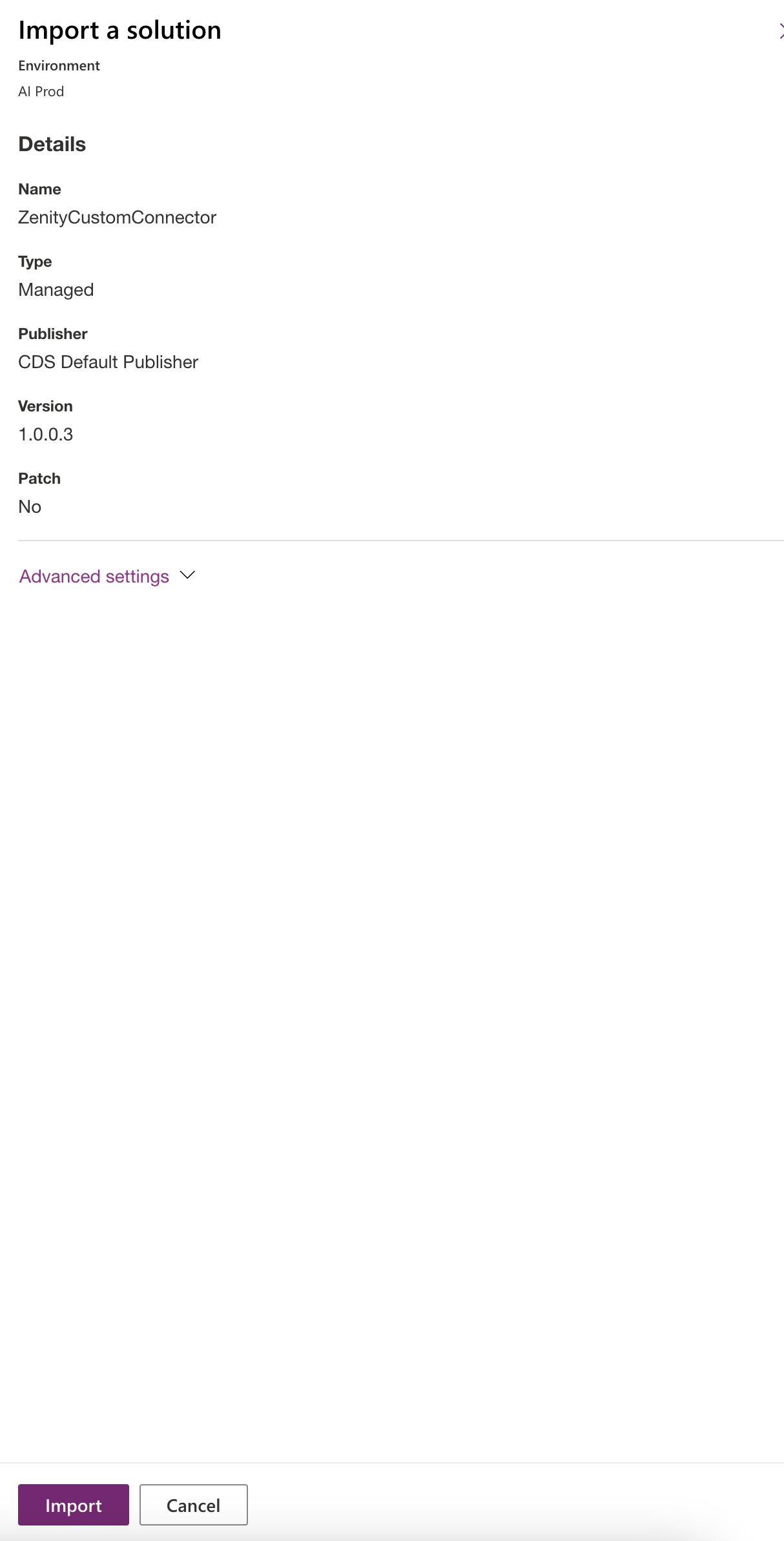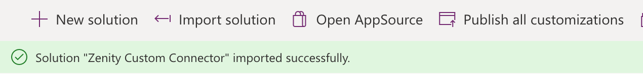 - Monitor the progress until the "Zenity Custom Connector" solution is successfully imported.